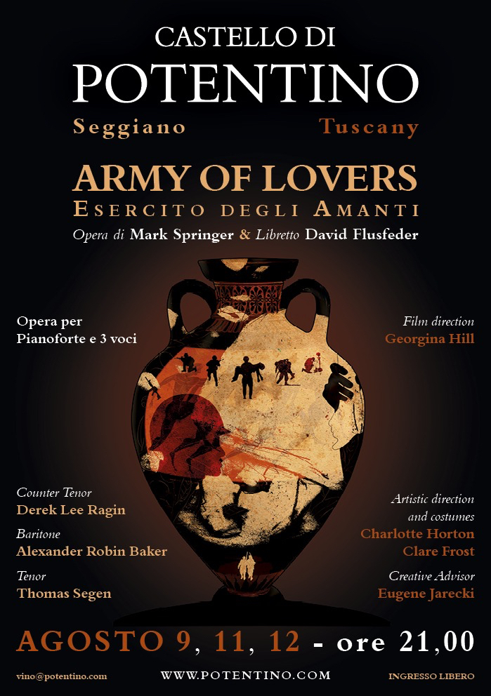 Our opera is based on the legend of the Sacred Band of Thebes: 150 pairs of male lovers, the single greatest fighting force of the Classical age. The strength of the army was due to the strength of the individual bond between each of its lovers, as well as, Plutarch related 400 years later, the shame that would result if a lover showed cowardice in front of his beloved. The army’s combination of love, loyalty and passion made it fearsome and unbeatable.
